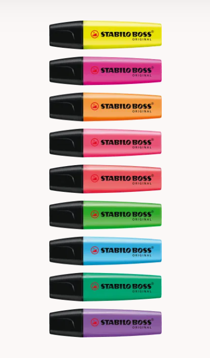 STABILO BOSS ORIGINAL è l’evidenziatore n. 1 in Europa: dal 1971 è la prima scelta per generazioni di studenti, lavoratori, artisti e professionisti del design. STABILO BOSS ha un design unico e i suoi colori fluorescenti sono ormai un’icona. Comodo da utilizzare, è disponibile in tantissimi colori fluo, pastel e ispirati alla natura. Non preoccuparti se ti dimentichi di rimettere il tappo: grazie alla tecnologia STABILO Anti-Dry-Out, STABILO BOSS ORIGINAL può essere lasciato senza tappo fino a 4 ore e l’inchiostro a base d’acqua non si secca, per lavorare ancora più concentrati. Perfetto non solo per evidenziare e sottolineare, ma anche per handlettering, bozzetti, ombreggiature ed effetti acquarello. Tutte queste caratteristiche rendono STABILO BOSS ORIGINAL l’evidenziatore perfetto di cui fidarsi sempre.